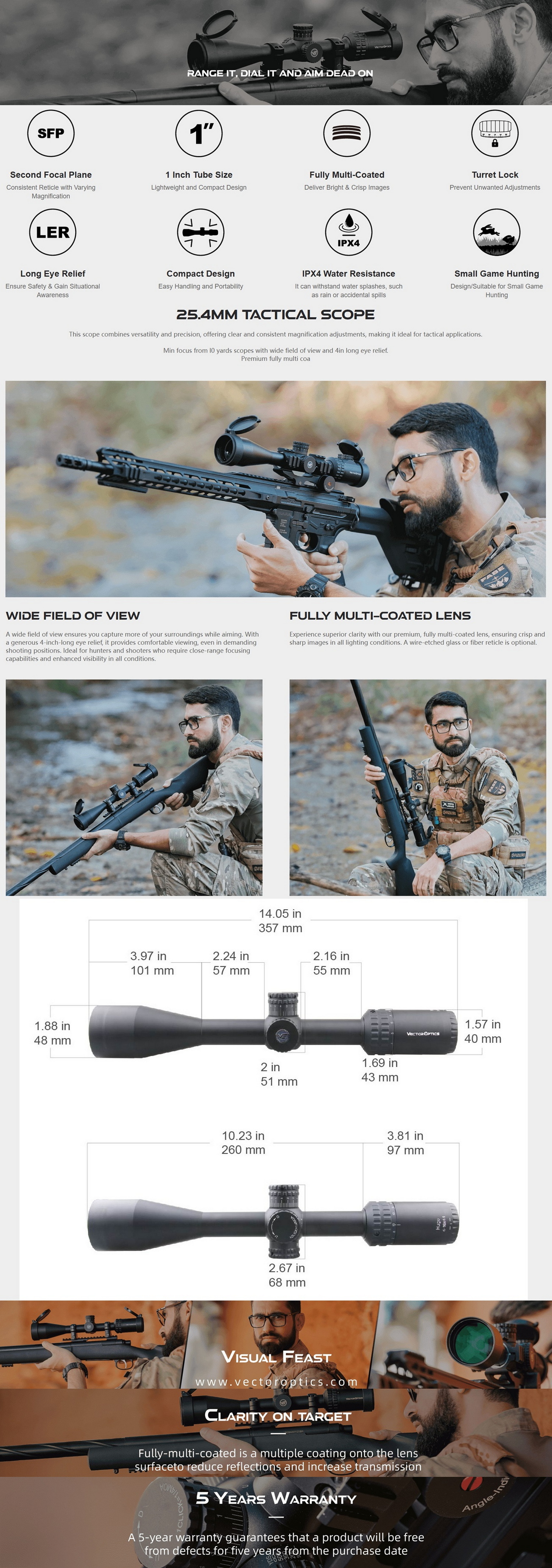 - การใช้เรติเคิล BDC และเรติเคิลที่หลากหลายตั้งค่าไว้ที่พลัง 10 เท่า เกมใหญ่ 22LR Rimfire และปืนไรเฟิล varmint สูงสุด 600 หลา