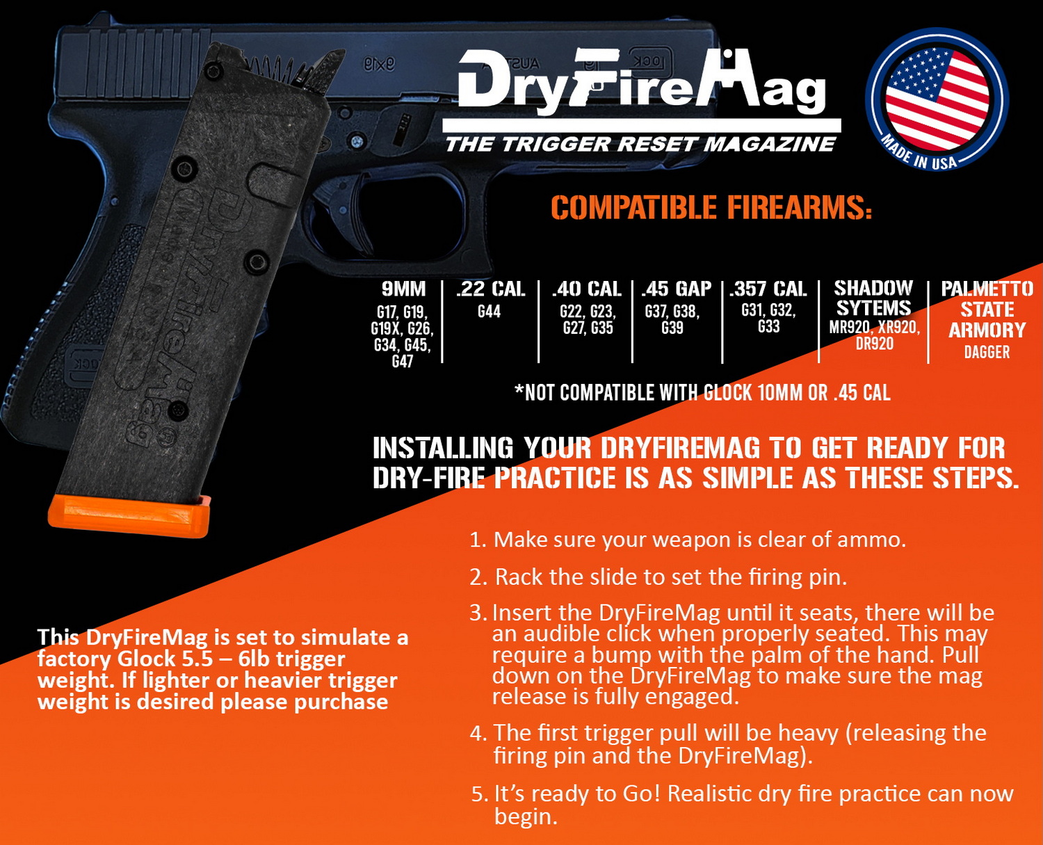 - OPTIONAL SPRING KIT TO ADJUST TRIGGER WEIGHT - The DryFireMag is set to simulate a factory Glock 5.5 – 6lb trigger weight.
