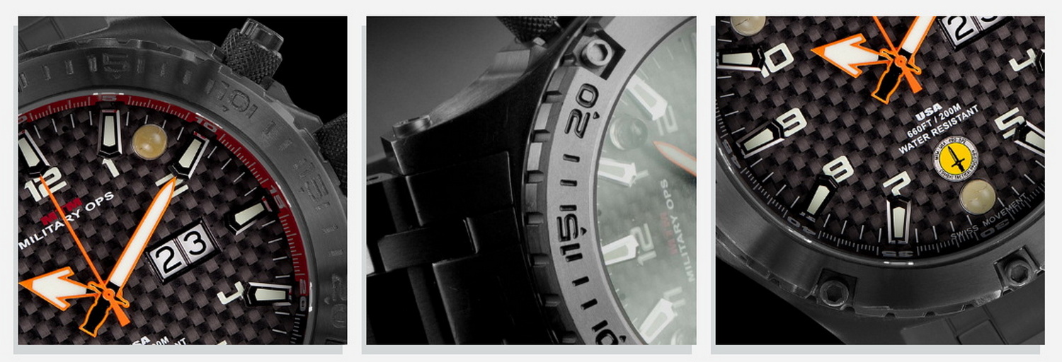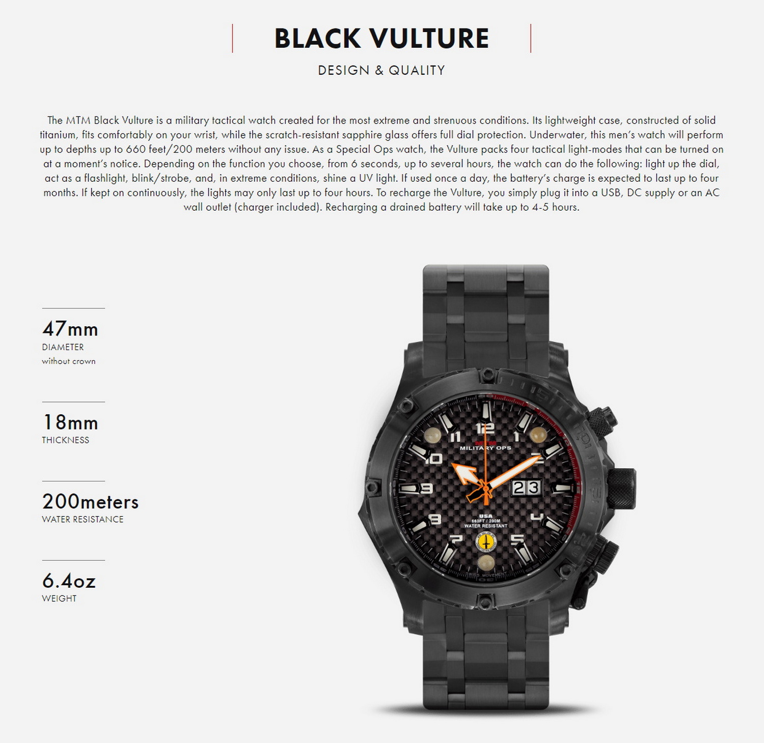 - The MTM Black Vulture is a military tactical watch created for the most extreme and strenuous conditions. Its lightweight case, constructed of solid titanium, fits comfortably on your wrist, while the scratch-resistant sapphire glass offers full dial protection. Underwater, this men’s watch will perform up to depths up to 660 feet/200 meters without any issue. As a Special Ops watch, the Vulture packs four tactical light-modes that can be turned on at a moment’s notice. Depending on the function you choose, from 6 seconds, up to several hours, the watch can do the following: light up the dial, act as a flashlight, blink/strobe, and, in extreme conditions, shine a UV light. If used once a day, the battery’s charge is expected to last up to four months. If kept on continuously, the lights may only last up to four hours. To recharge the Vulture, you simply plug it into a USB, DC supply or an AC wall outlet (charger included). Recharging a drained battery will take up to 4-5 hours.