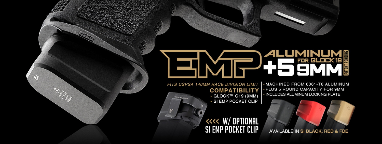 - The Strike Industries Aluminum Extended Magazine Plate for GLOCK™ G19 (9mm) was designed to provide smoother magazine reloading through a slow drag / no snag design while maintaining maximum magazine capacity. Machined from 6061-T6 aluminum, this Extended Magazine Plate (EMP) adds plus 5 9mm rounds to OEM double stack GLOCK™ G19 magazines. Following the success of our EMP systems for pistols, the form factor and unique geometric design gives a unified and aggressive aesthetic look to your GLOCK™ G19. Included is an aluminum plate which adds extra locking security. Give your GLOCK™ pistol the extra rounds it deserves with the Strike Industries Aluminum Extended Magazine Plate (EMP) for GLOCK™ G19 (9mm).