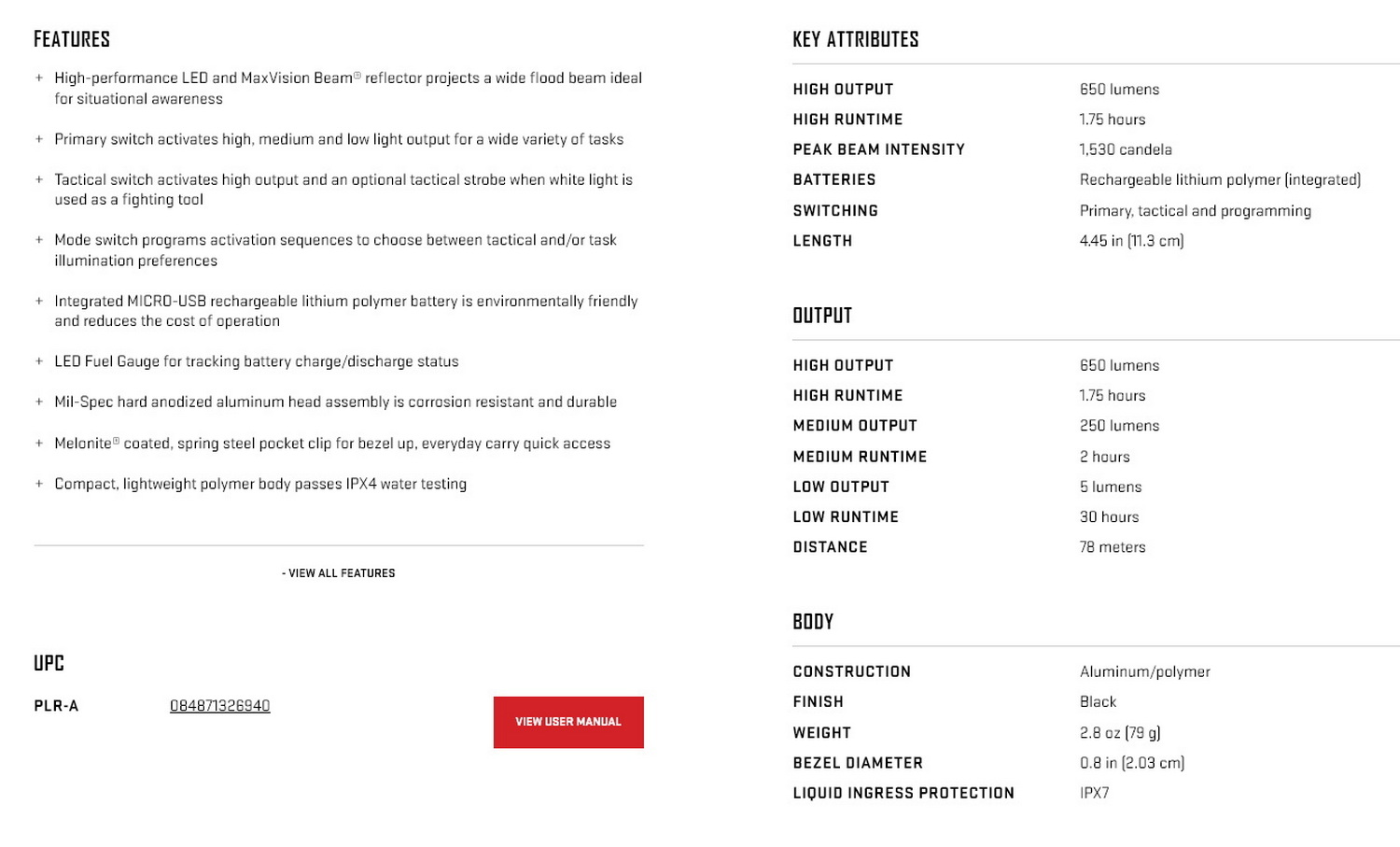 - Tactical switch activates high output and an optional tactical strobe when white light is used as a fighting tool