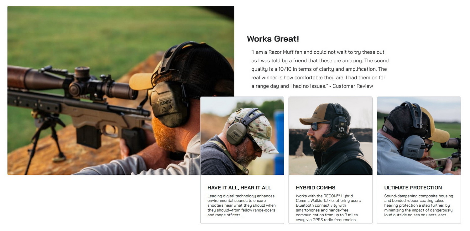 - ที่ครอบหู Recon Electronic ใหม่ล่าสุดของเรามีการบีบอัดเสียง (SAC) ที่รวดเร็วปานสายฟ้าแลบและระดับการลดเสียงรบกวน (NRR) ที่ 26 เพื่อให้แน่ใจว่าการได้ยินของคุณได้รับการปกป้องอยู่เสมอ