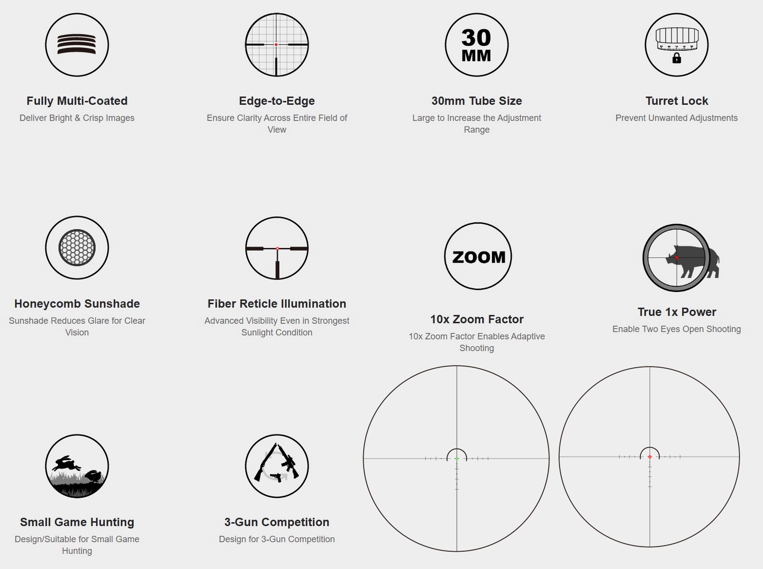 - ซูม 1-10 เท่าช่วยให้เล็งเป้าหมายได้หลากหลายสำหรับระยะการยิงที่แตกต่างกัน