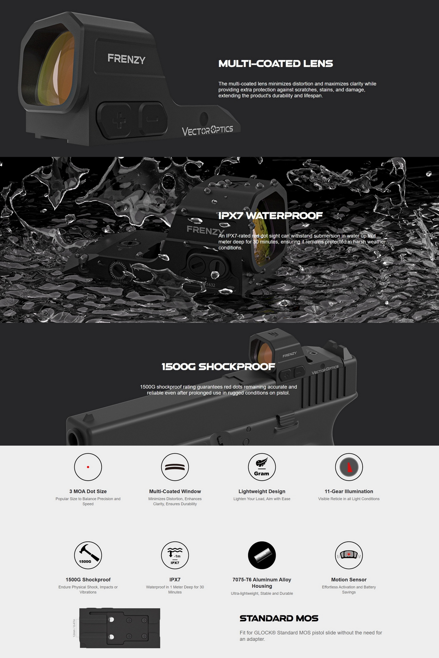 - จุดเล็ง 3MOA, ช่องมอง 16×21 มม. / 0.63x0.83 นิ้ว, หนักเพียง 33 กรัม / 1.16 ออนซ์, ปรับแต่งให้เหมาะสำหรับปืนพก