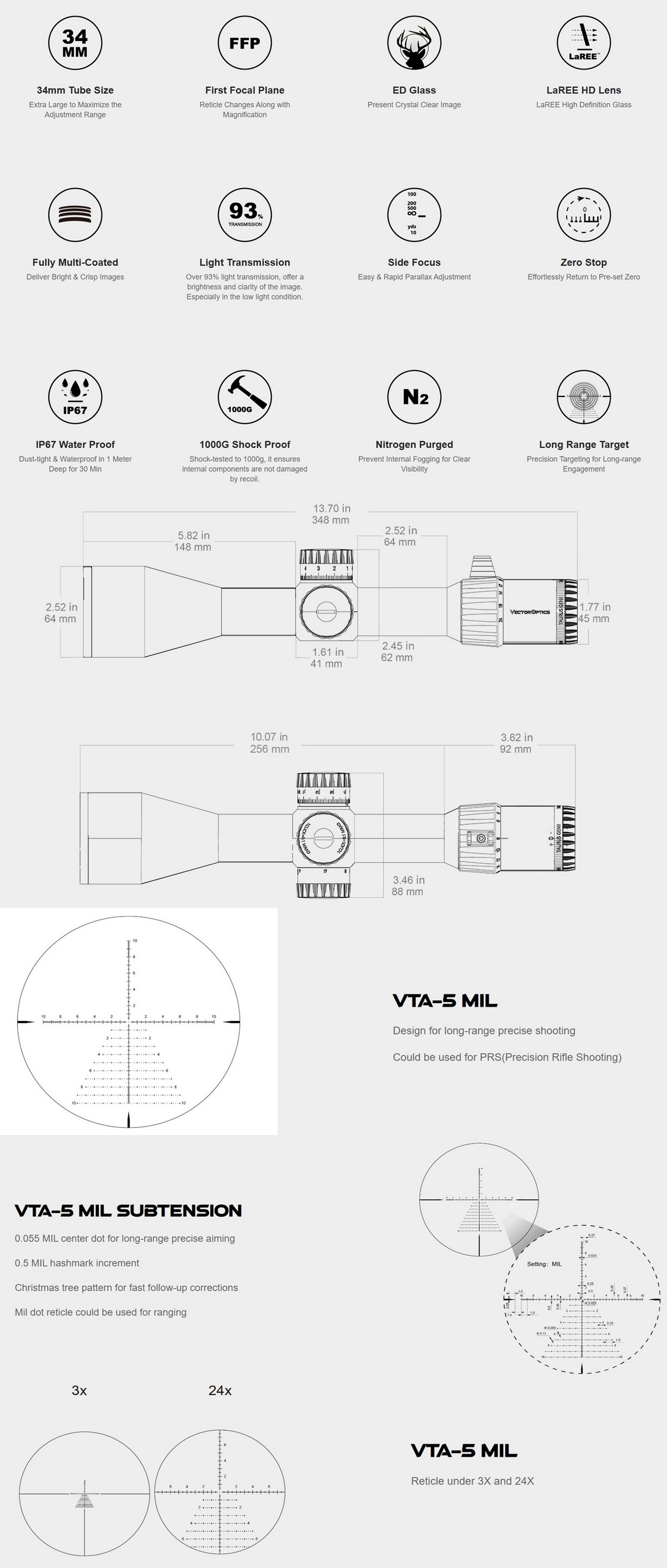 • เรติเคิล VTA-5MIL ออกแบบเพื่อการยิงระยะไกลที่แม่นยำ สามารถใช้กับการยิงปืนไรเฟิลแม่นยำ (PRS)