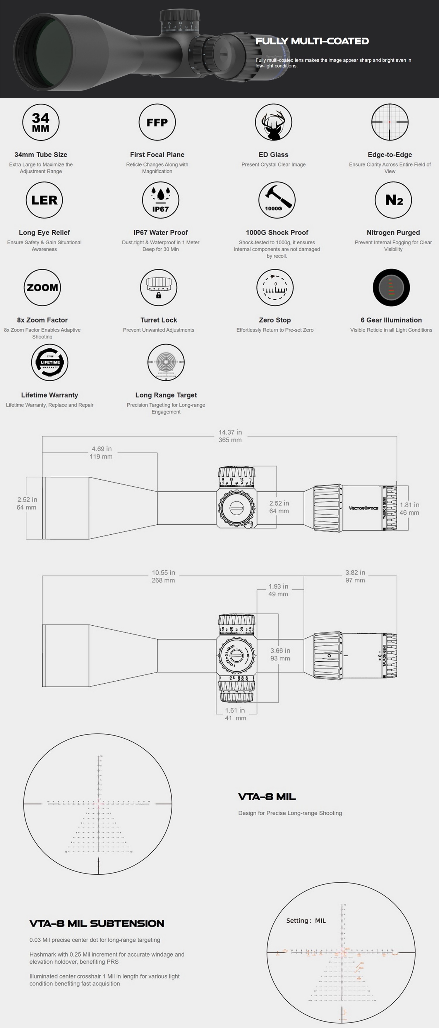 • สิ่งของในบรรจุภัณฑ์: คู่มือผู้ใช้, ผ้าเช็ดทำความสะอาด, ประแจพลาสติก, ฝาครอบเลนส์ยาง, ที่บังแดด, คันโยก, ประแจหกเหลี่ยม, แหวน Picatinny ขนาด 34 มม. ฯลฯ