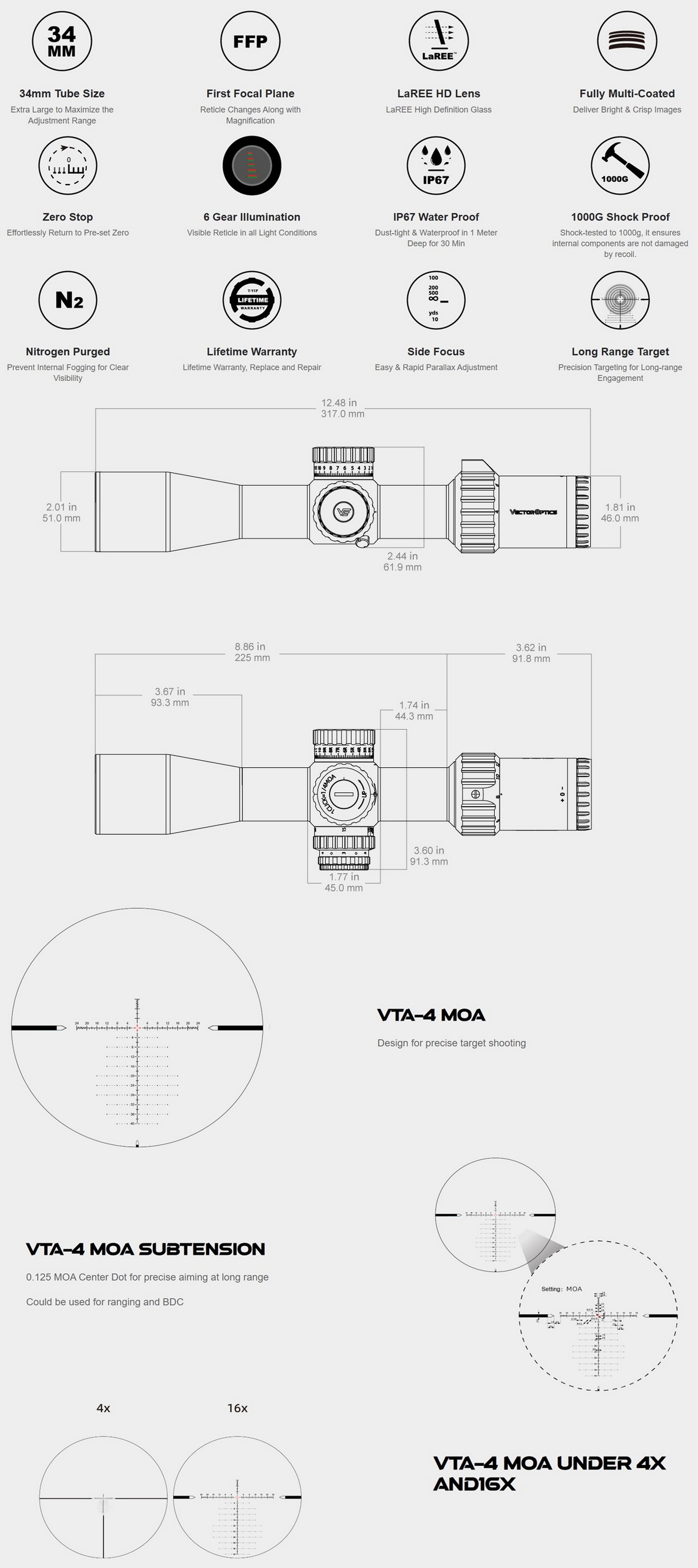• เส้นเล็ง FFP VTA-4 MOA เพื่อการยิงเป้าหมายที่แม่นยำ ส่องสว่างตรงกลางเพื่อการจับเป้าหมายอย่างรวดเร็ว