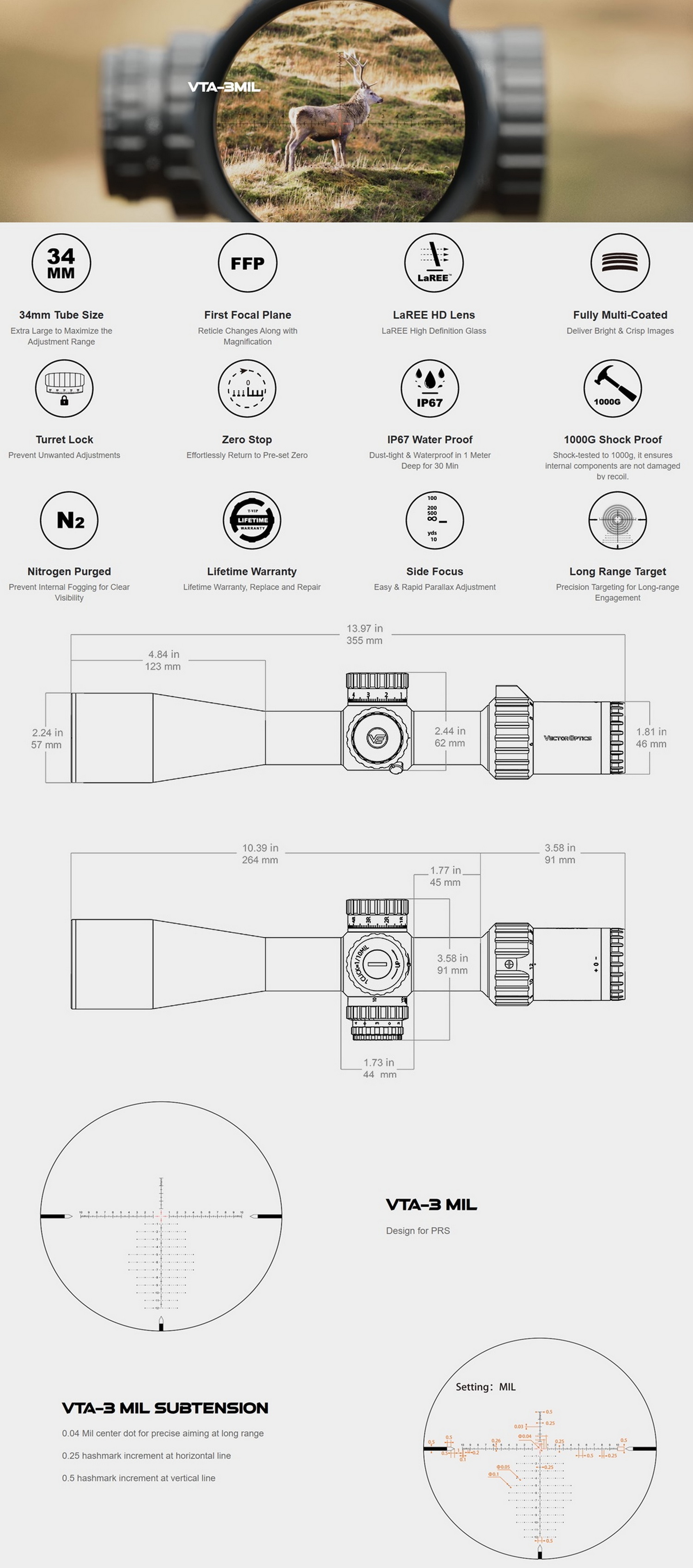 - เรติเคิล FFP VTA-3 MIL Dot, จุดศูนย์กลาง 0.04 มิล สำหรับการยิงปืนไรเฟิลที่แม่นยำ พร้อมระบบส่องสว่าง 6 เกียร์