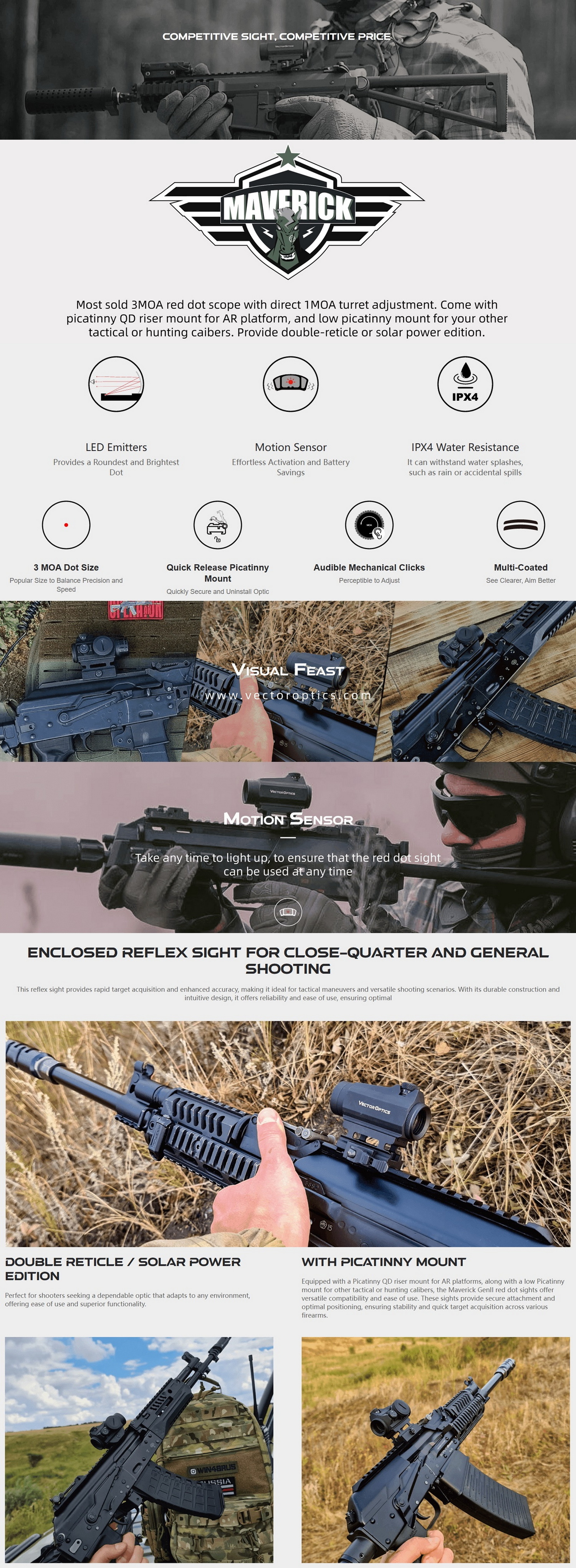 • สินค้าภายในกล่อง: บรรจุภัณฑ์ขายปลีก, ฐาน Picatinny แบบปลดเร็ว, ฐาน Low Weaver, ฝาครอบเลนส์, ประแจหกเหลี่ยม และผ้าเช็ดทำความสะอาด ฯลฯ