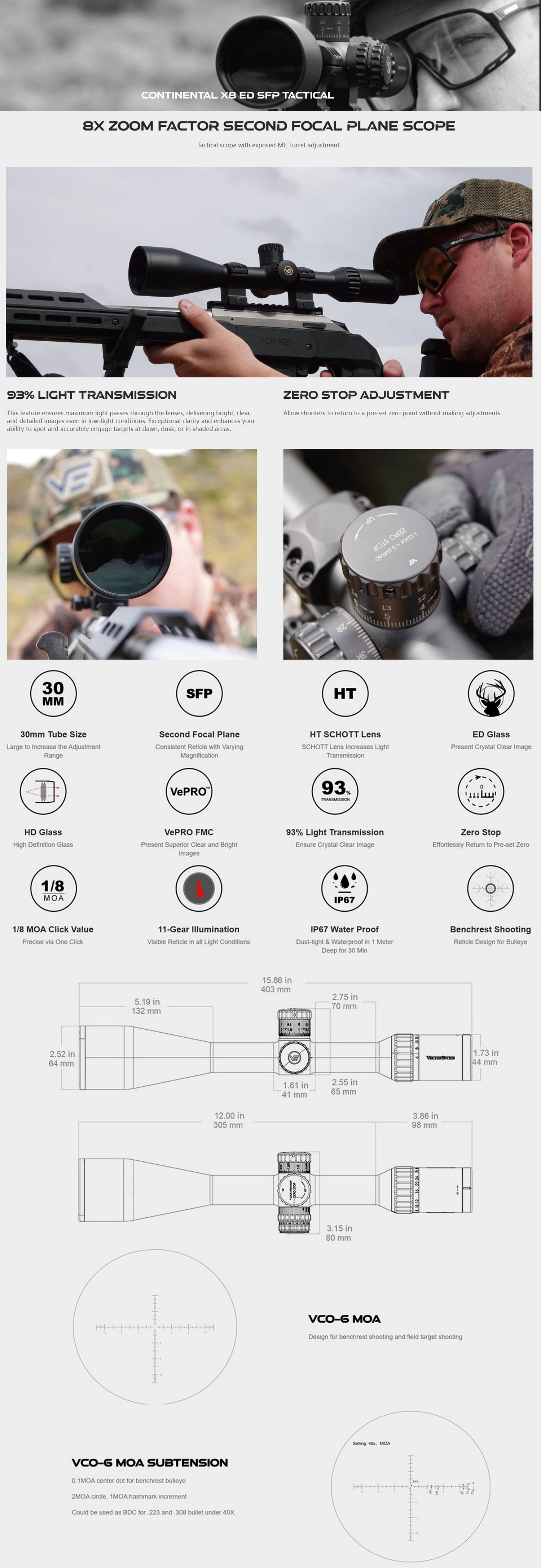 - VCO-6MOA ออกแบบมาสำหรับการยิงปืนและการยิงเป้าหมายสนาม, จุดศูนย์กลาง 0.1MOA ขนาดเล็กสำหรับ bullseye