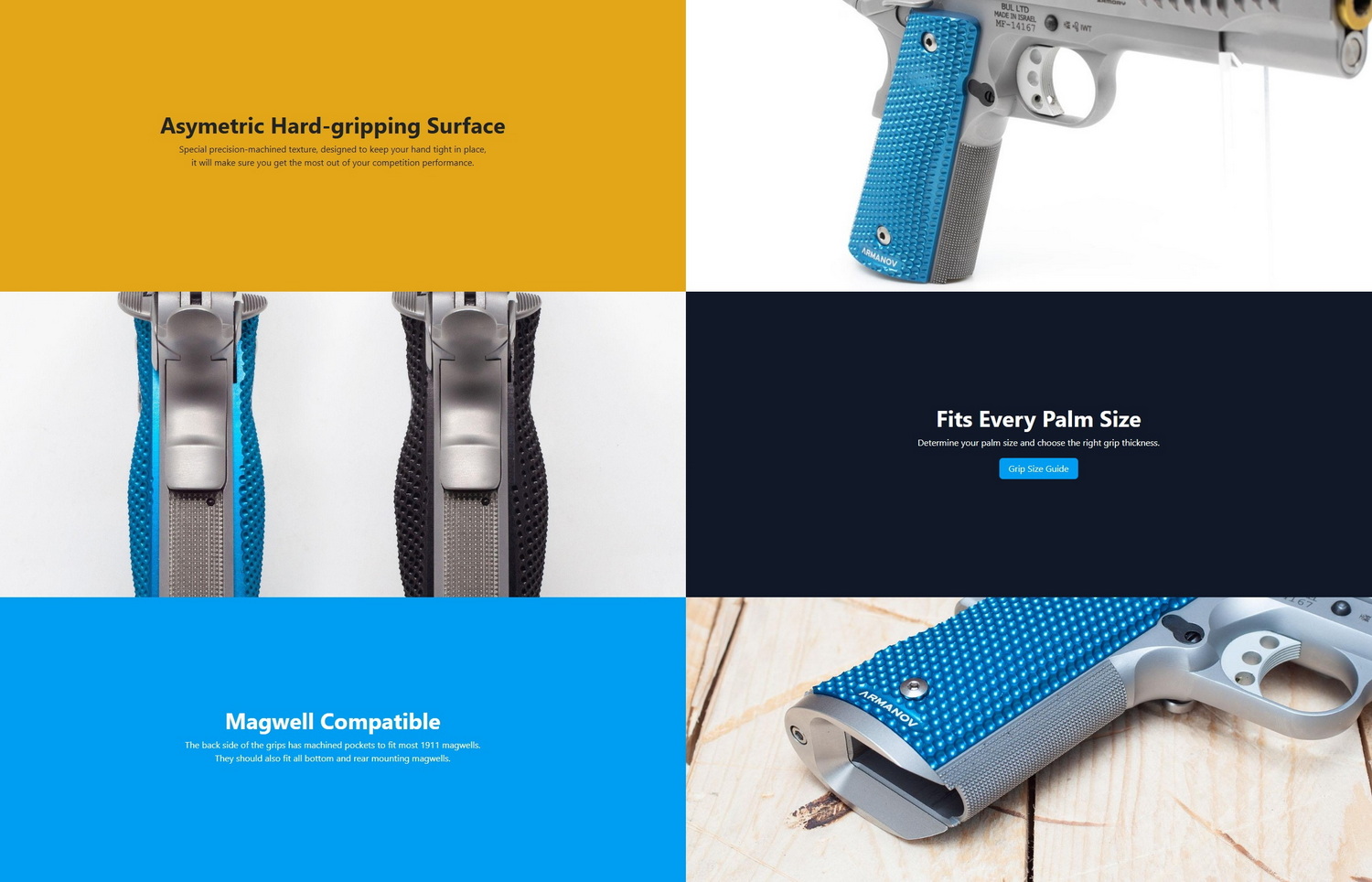 - Armanov has developed new state-of-the-art, unique grips for full-size 1911 pistols, featuring asymetric, ergonomical contour and aggressive, hard-gripping surface. Sticky like a spider web and ergonomical for a natural feel.
