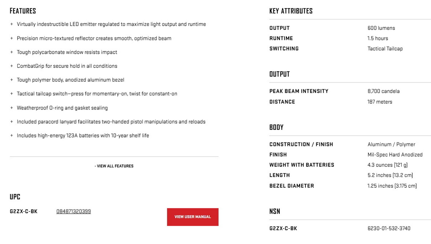 - ออกแบบมาโดยเฉพาะสำหรับใช้ร่วมกับปืนพก ความสว่าง LED 600 ลูเมน