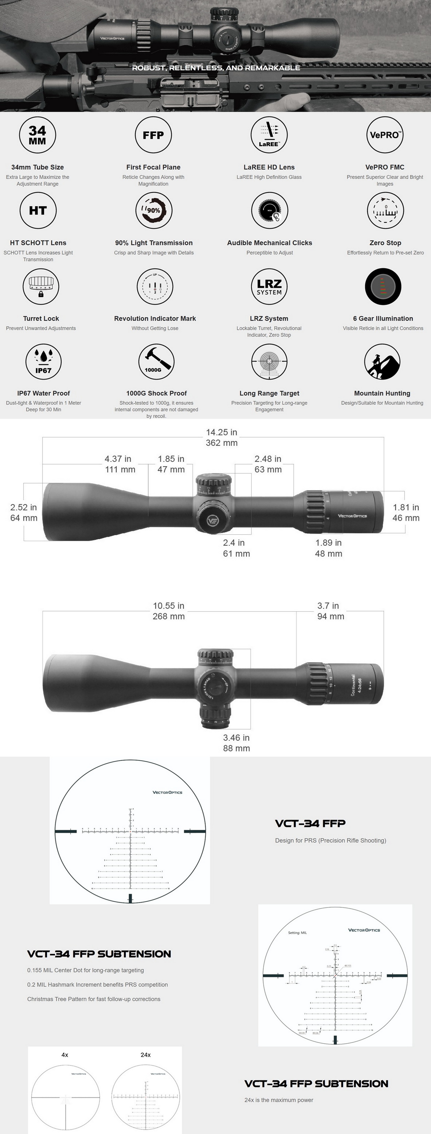 - เส้นเล็ง VCT-34 FFP, จุดศูนย์กลาง 0.155 MIL, การเพิ่มเครื่องหมายแฮชมาร์ค 0.2 MIL, ลวดลายต้นคริสต์มาส, ออกแบบมาสำหรับการยิงปืนไรเฟิลแม่นยำ (PRS)