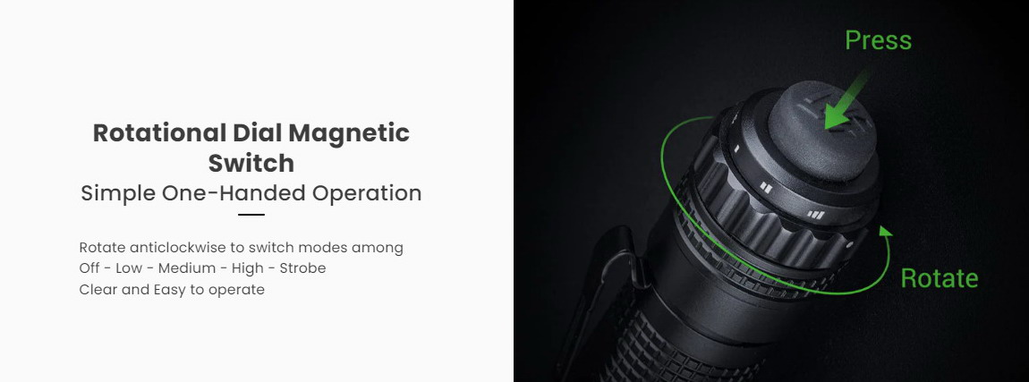 - สวิทซ์ท้ายถูกออกแบบมาให้เป็นระบบแม่เหล็กแบบหมุนที่ท้ายไฟฉาย ทำให้ได้รับความสะดวกในการใช้งาน