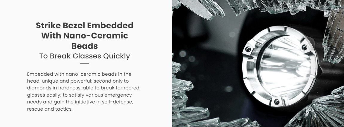 - ส่วนหัวไฟฉายเป็นวงแหวนสแตนเลสสตีลซึ่งจะมีหมุดนาโนเซรามิคที่มีความแข็งสูงมากฝังอยู่ 3 จุด