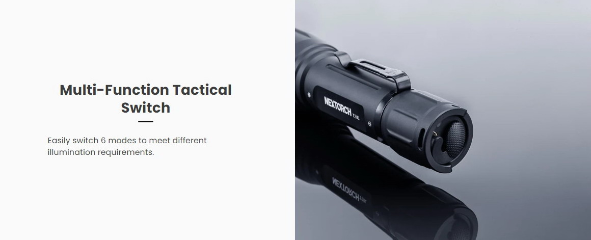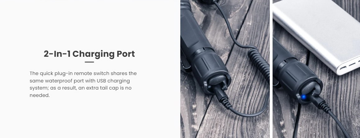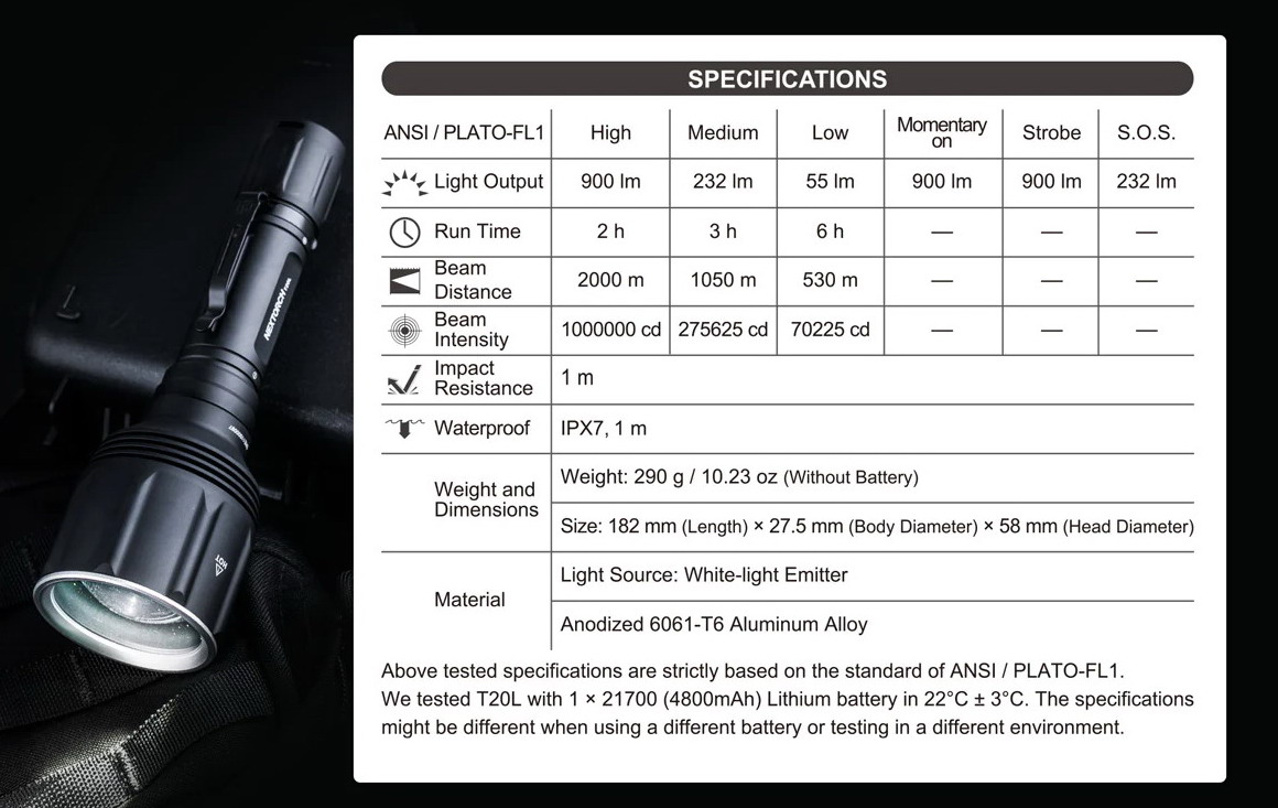 - โหมดใช้งาน:High: 900 lm / Medium: 232 lm / Low: 55 lm / Strobe: 900 lm / S.O.S: 232 lm