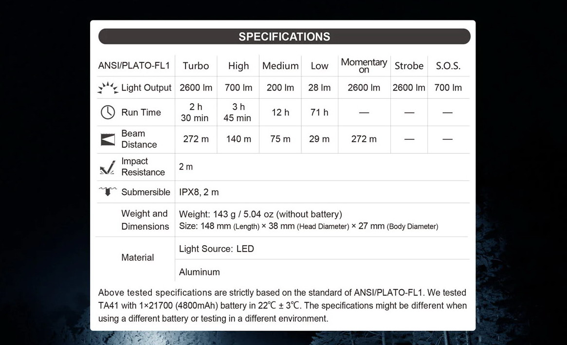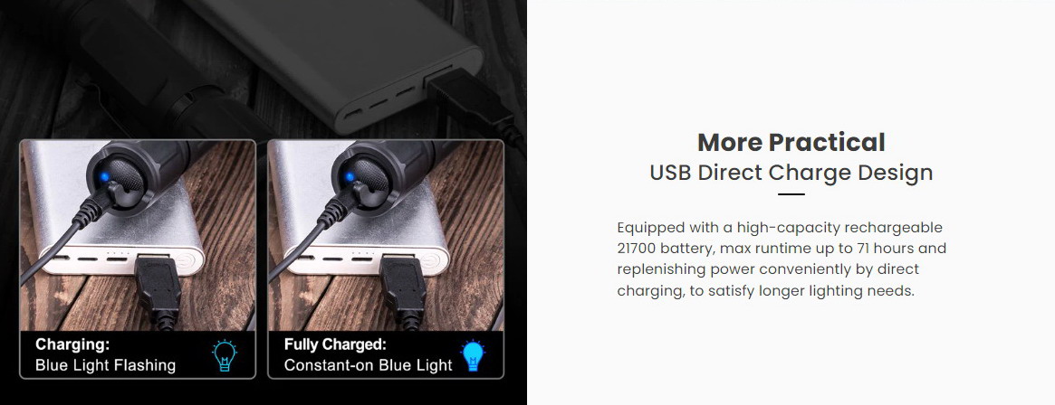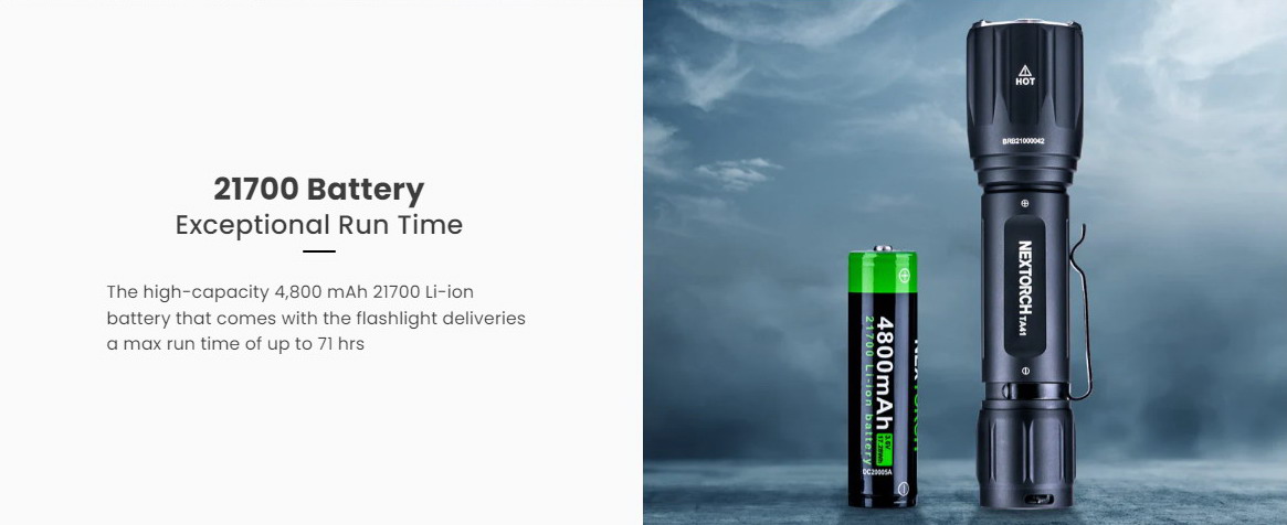 - มาพร้อมแบตเตอรี่ 21700 แบบชาร์จใหม่ได้ความจุสูง ใช้งานได้นานสูงสุด 71 ชม.ในระดับแสงต่ำ