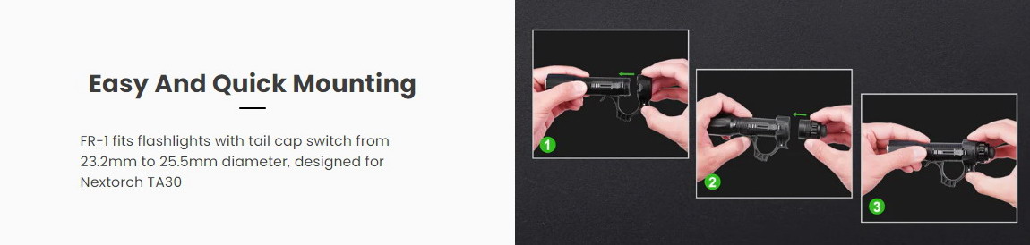 - เพิ่มเติมในการพกพาและใช้งานไฟฉาย ปรับให้เข้ากับไฟฉายขนาดมาตรฐาน ที่สวิตช์ฝาปิดท้ายขนาด 23.2 มม. ถึง 25.5 มม. เช่น TA30
