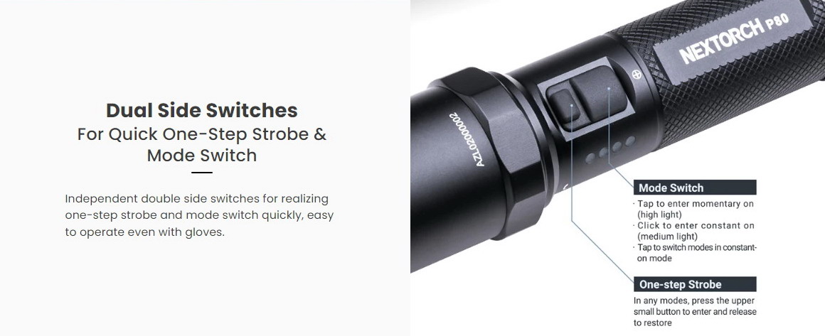 - การออกแบบสวิตช์สองด้านสามารถใช้ไฟแฟลชแบบขั้นตอนเดียวและสวิตช์โหมดได้อย่างรวดเร็ว