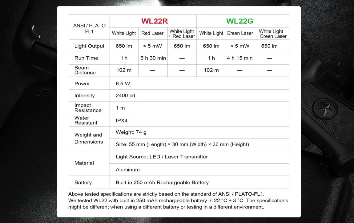 - โหมดใช้งาน:แสงขาว 650 lm / Green Laser <5 mW / แสงขาว 650 lm + Green Laser <5 mW