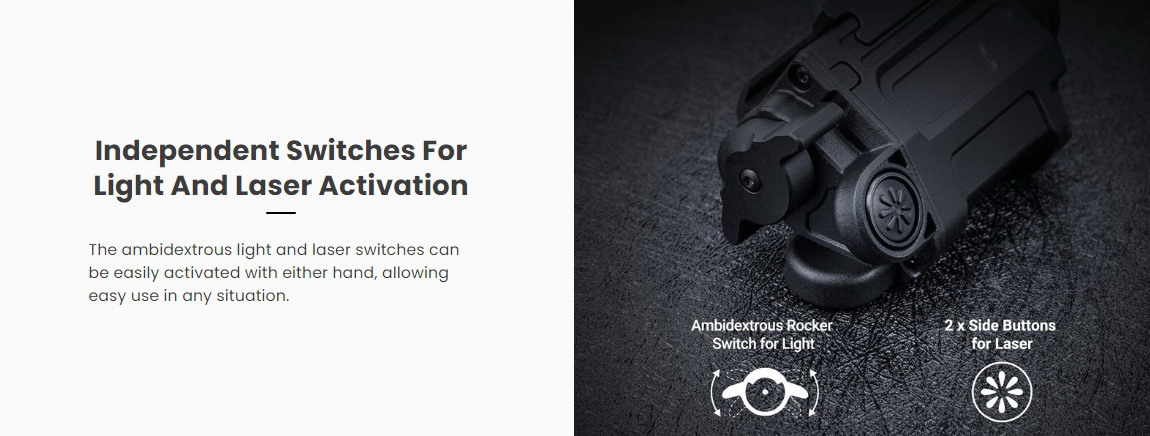 - สวิทซ์ท้ายสะดวกในการใช้งาน รองรับกับราง picatinny และ Glock