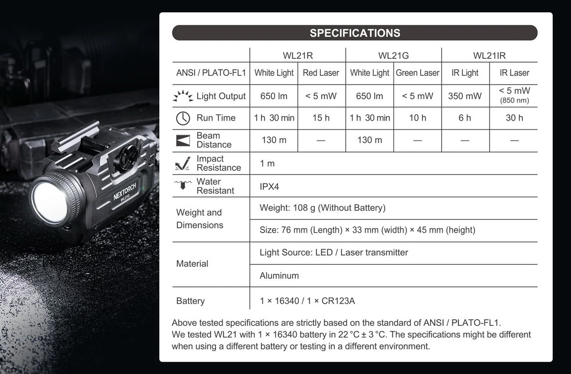 - WL21 ไฟฉายติดปืนสั้นความสว่างสูงถึง 650 ลูเมน พร้อมมีแสงเลเซอร์สีเขียว