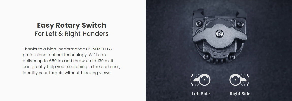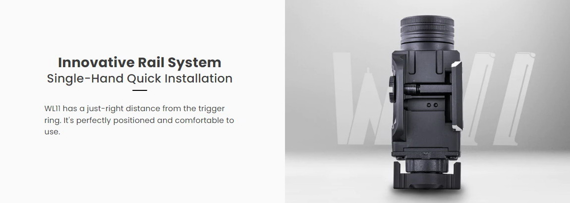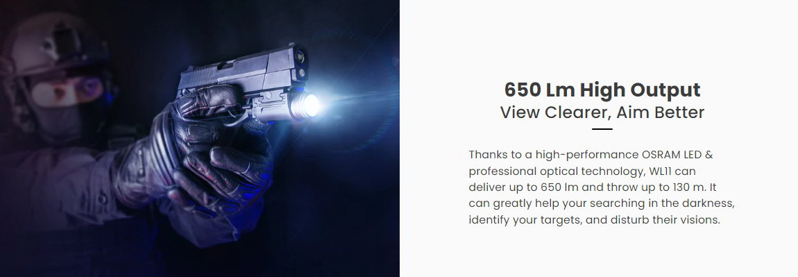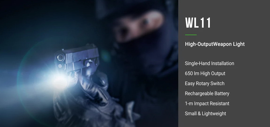 - WL11 เป็นไฟปืนพกขนาดกะทัดรัดและน้ำหนักเบา ให้ความสว่างสูงสุด 650 ลูเมน และระยะลำแสง 130 ม.