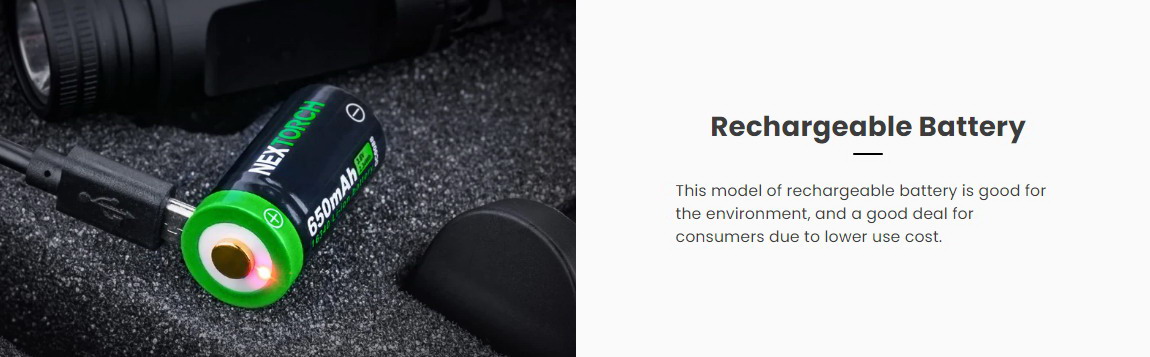 - ใช้พลังงานจากแบตเตอรี่แบบชาร์จซ้ำได้ 16340 หรือแบตเตอรี่ cr1234a 1 ก้อน