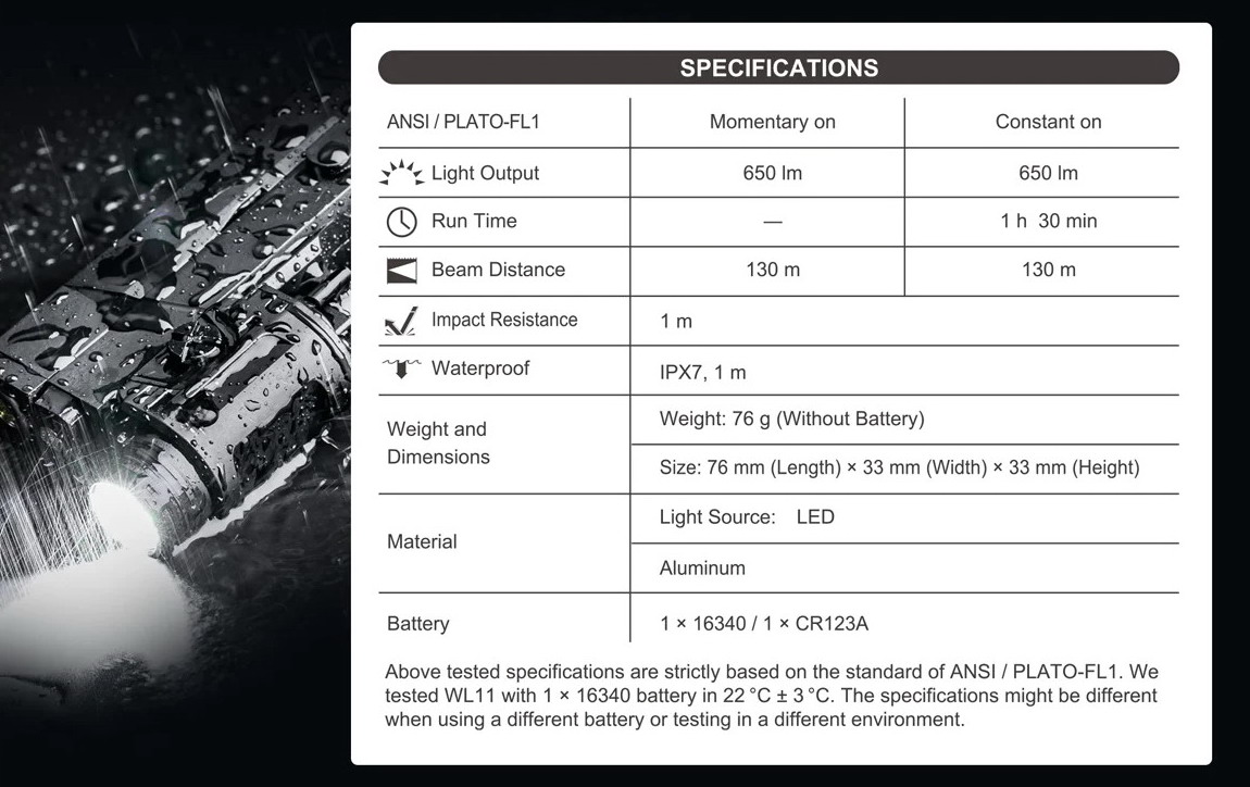- แบตเตอรี่:1 x 16340, 1 x CR123A