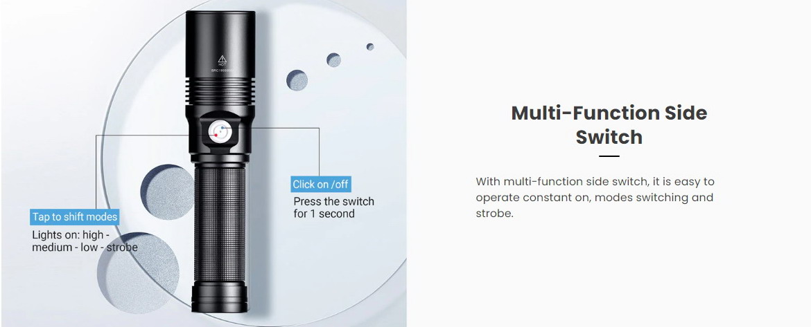 - สวิตช์ที่ใช้งานง่ายระหว่างการเปิดคงที่ การสลับโหมดและแสงกระพริบ