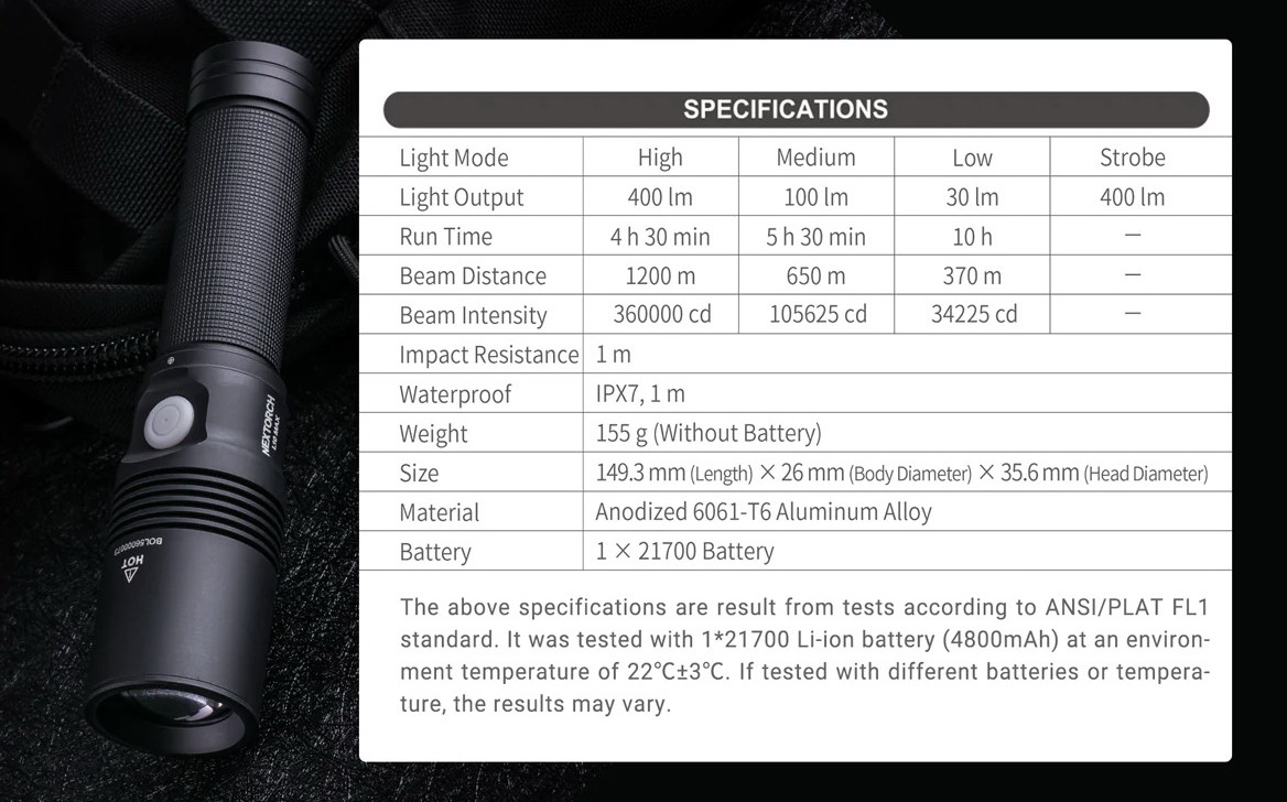 - โหมดใช้งาน:High: 400 lm / Medium: 100 lm / Low: 30 lm / Strobe: 400 lm