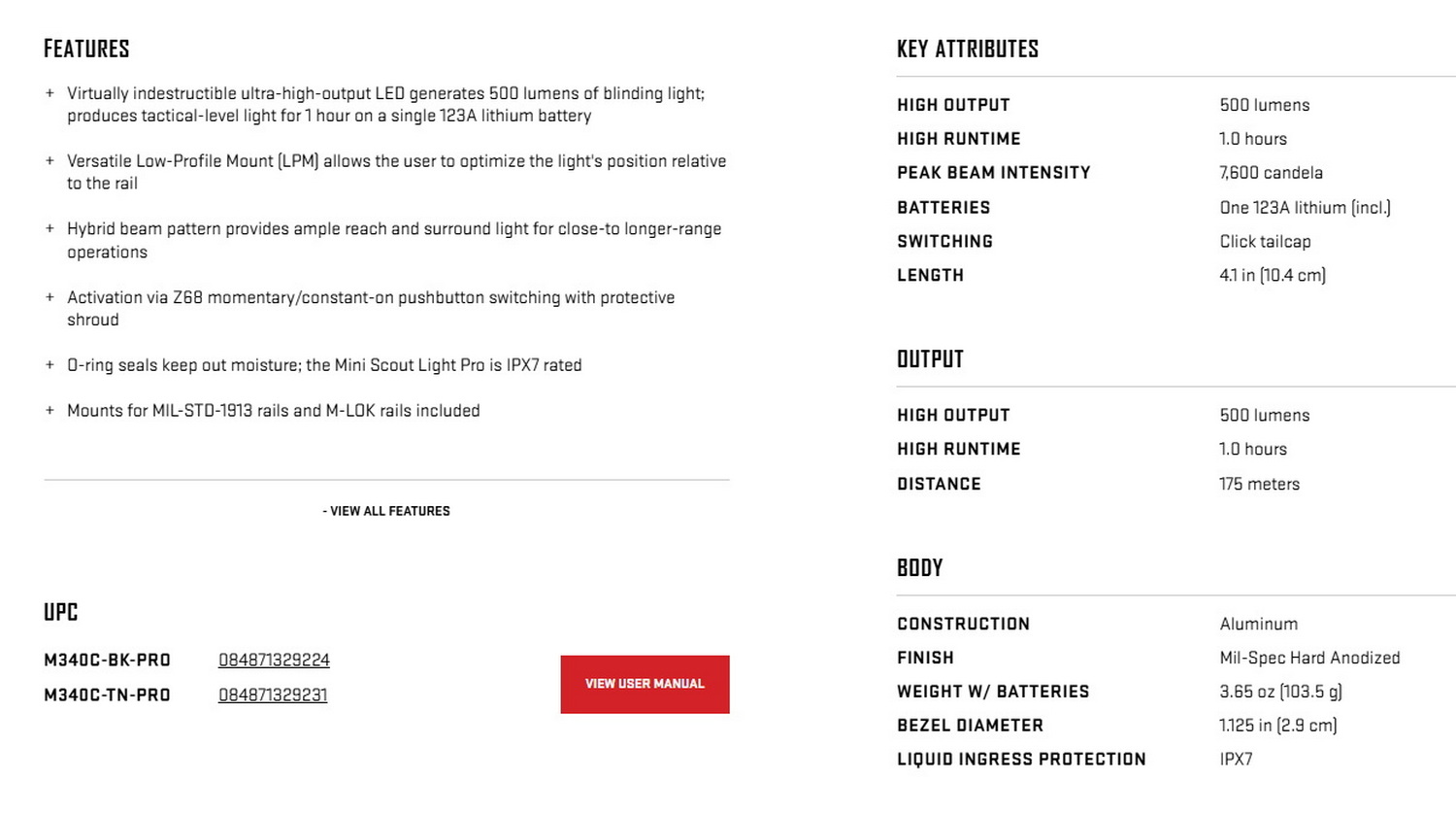 - Virtually indestructible ultra-high-output LED generates 500 lumens of blinding light; produces tactical-level light for 1 hour on a single 123A lithium battery