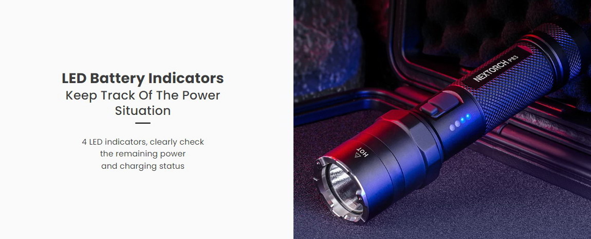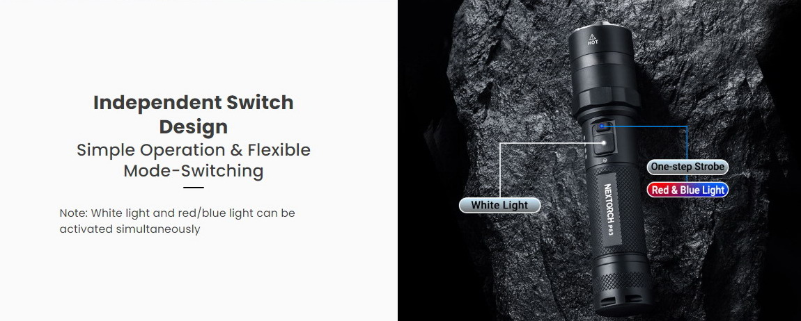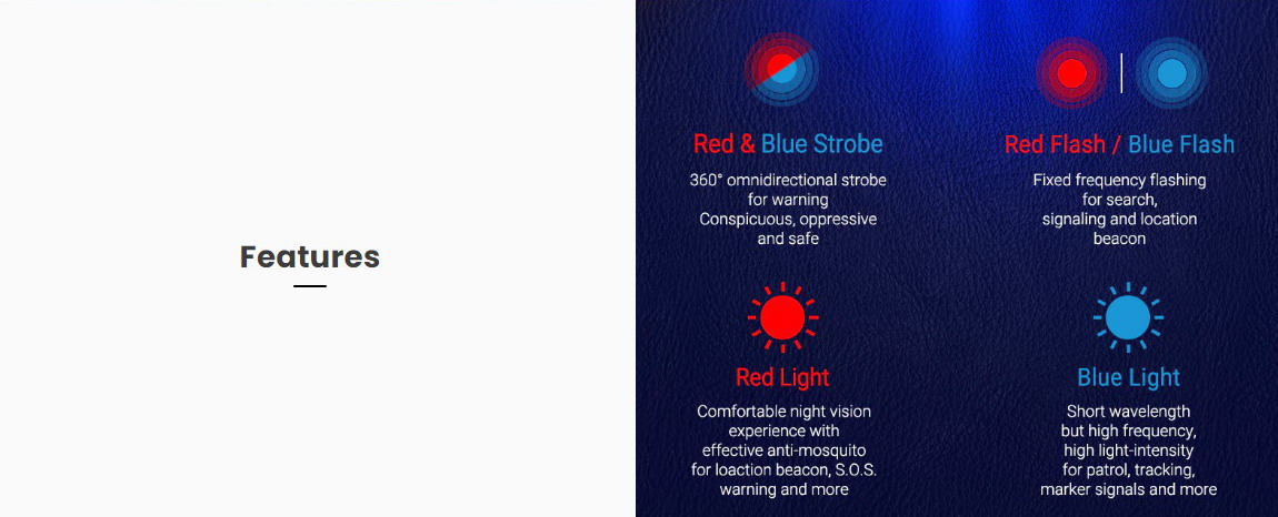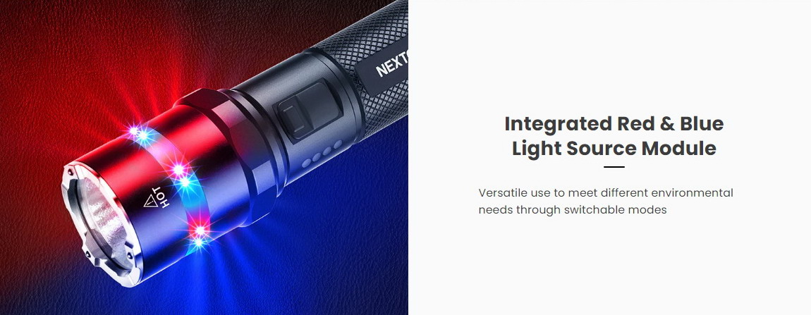 - ไฟฉายมีไฟสัญญาณสีแดงและสีน้ำเงินที่ไฟฉาย สำหรับเตือนและความปลอดภัย