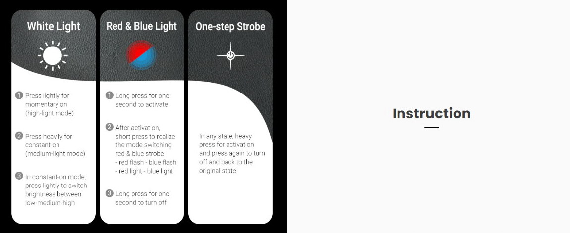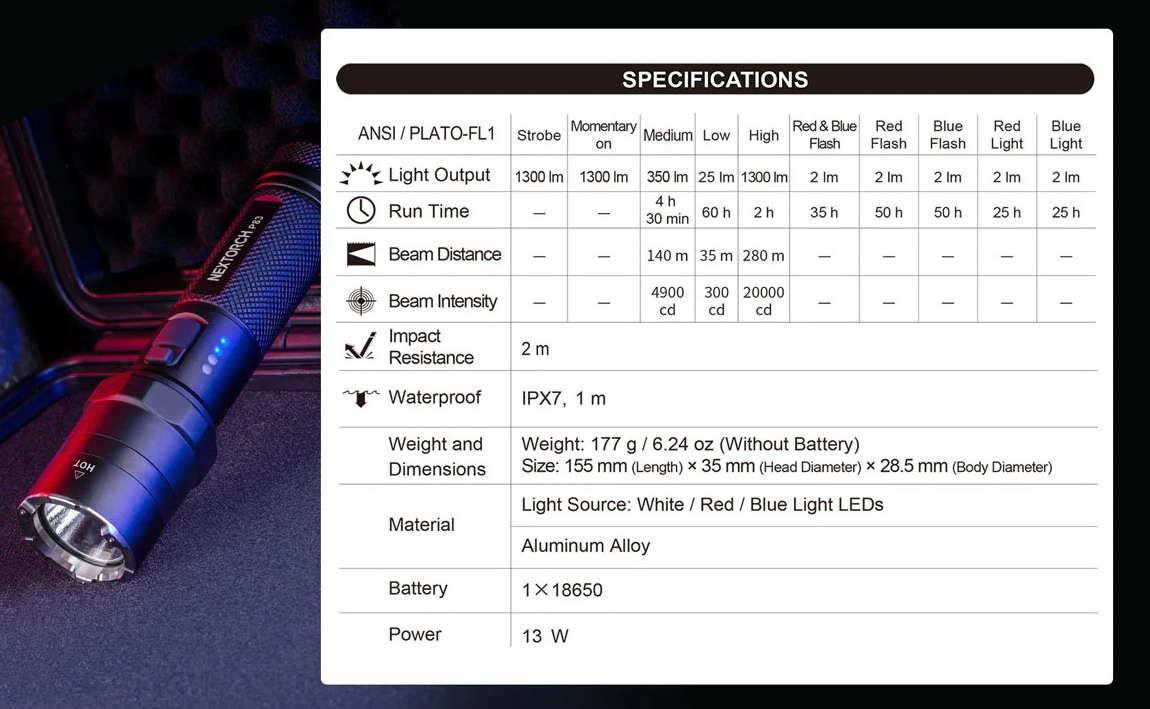 - โหมด: 350 lm/25 lm/1300 lm/2 lm (แฟลชสีแดงและสีน้ำเงิน)/2 lm (แฟลชสีแดง)/2 lm (แฟลชสีน้ำเงิน)/2 lm (แสงสีแดง)/2 lm (แสงสีน้ำเงิน)/แฟลช