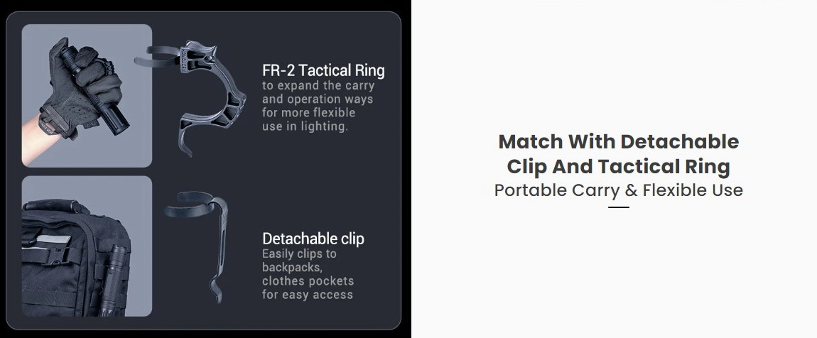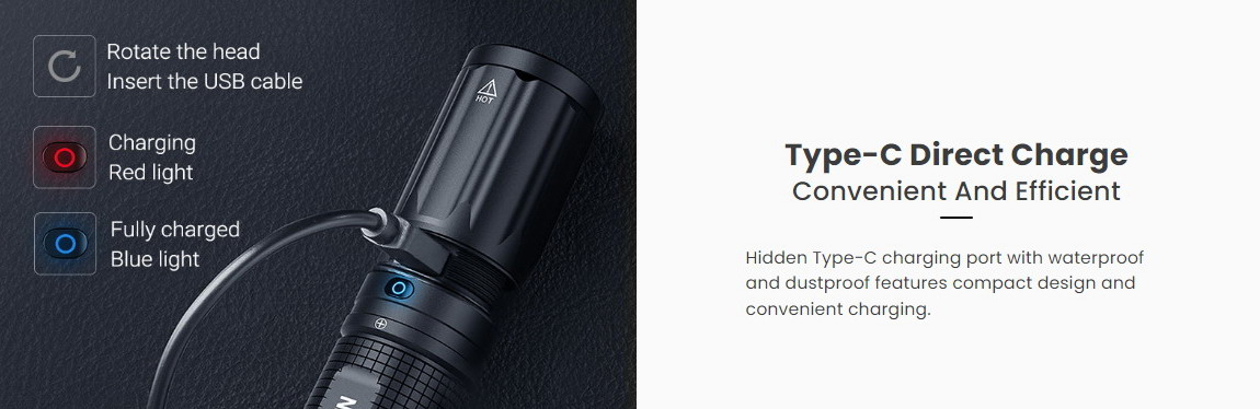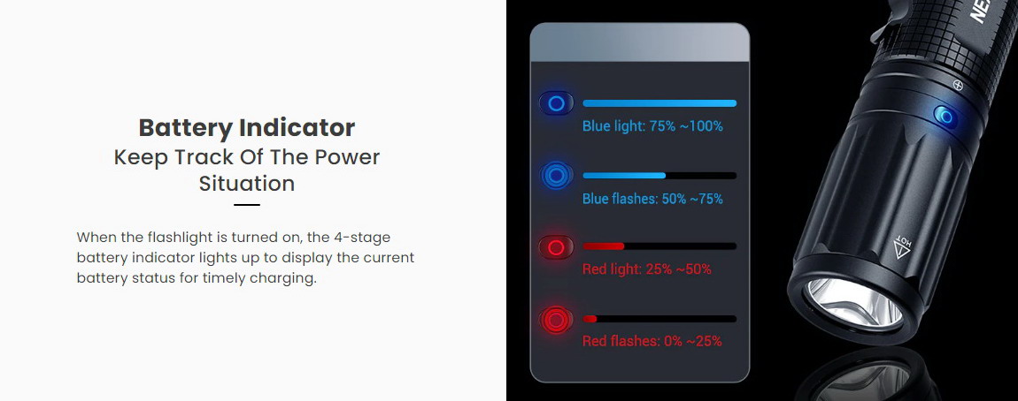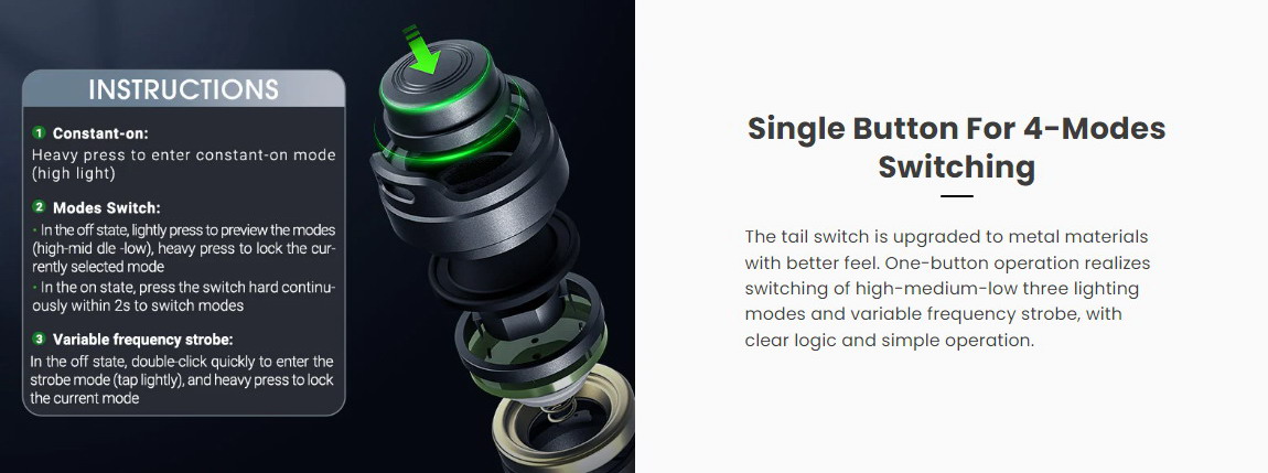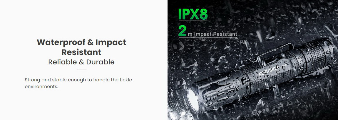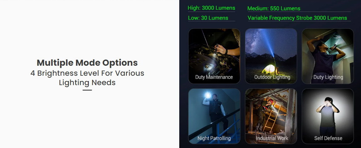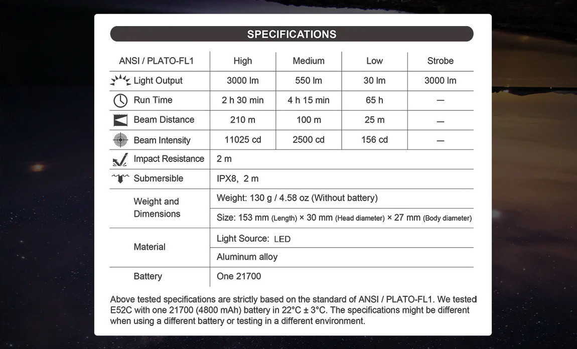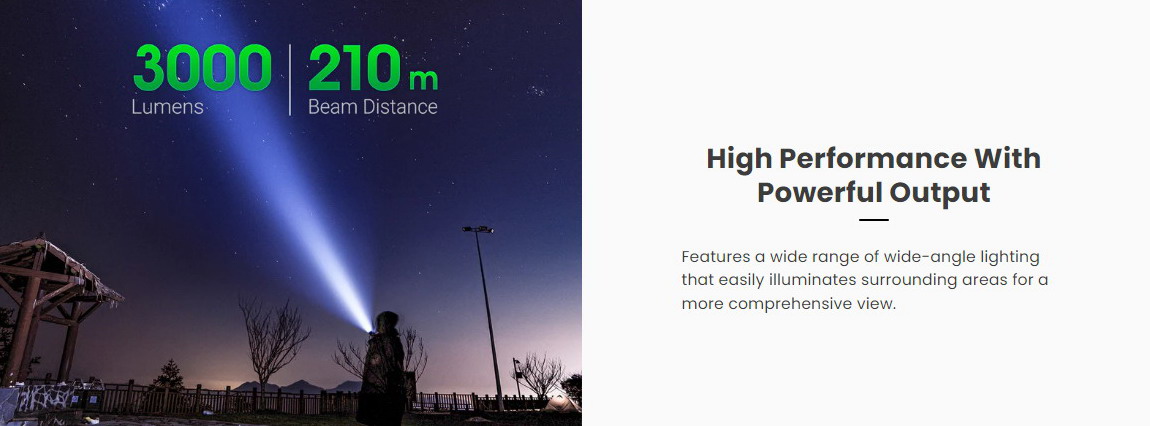 - เอาต์พุต: สูง/ กลาง/ ต่ำ/ Strobe/3000 lm / 550 lm / 30 lm / 3000 lm/ รันไทม์: 2 ชม. 30 นาที / 4 ชม. 15 นาที / 65 ชม. / –